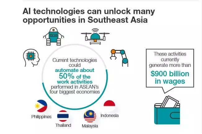 由于人工智能技术能够显著提高生产率,它可能会对东南亚地区的经济以及那里的工人产生破坏性影响。之前发布的MGI研究估计,目前已有的人工智能技术有可能使东盟四大经济体现有工作活动的一半走向自动化:印度尼西亚(52%),马来西亚(51%),菲律宾(48%)和泰国(55%)。这些工作目前产生的工资超过9000亿美元。
