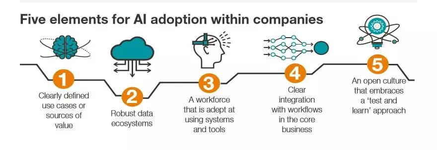 (5)与所有文化转型一样,领导力对于人工智能的成功实施至关重要。麦肯锡全球研究所的一项调查发现,那些成功部署了人工智能技术的公司受访者表示,相比于那些没有采用任何人工智能技术的公司,其高管层的支持度几乎是其他公司的两倍。