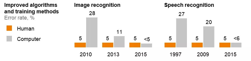 突然之间,机器已经能够完成那些曾经需要具备人类认知能力才能完成的任务。而在过去,计算机只能执行那些已经编写好的固定程序。而现在,人们可以提供一个可供计算机学习的通用策略,使它们能够在无需被重新编程的情况下处理新的数据。