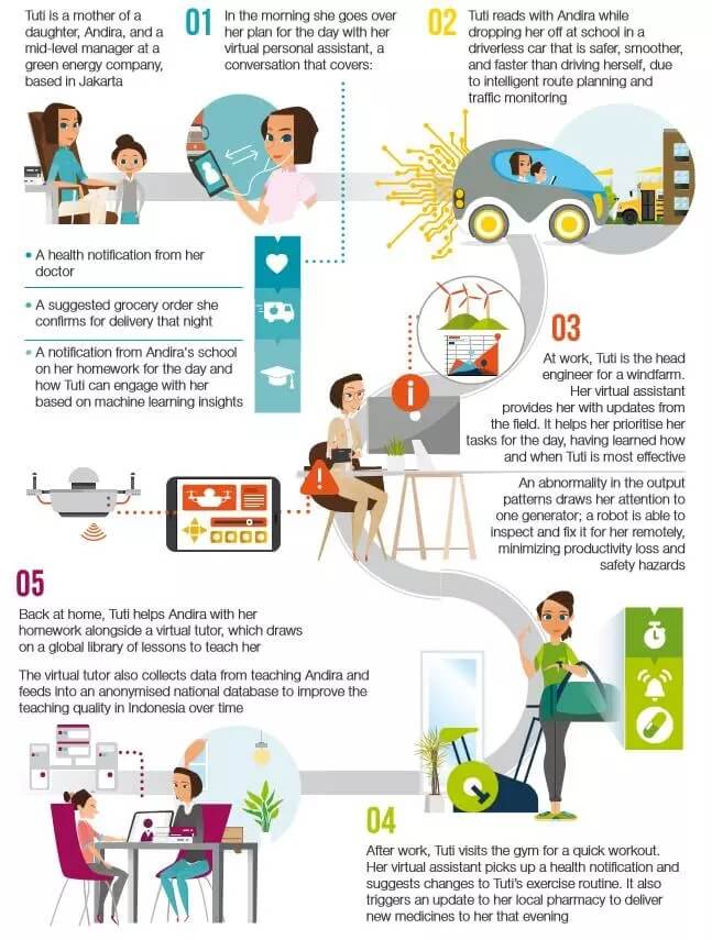 (3)在公司,Tuti是一个风力发电场的总工程师。她的虚拟助手为她提供了这个领域的最新信息。它帮助Tuti整理出当天需要优先处理的任务,因为它已经了解了Tuti在何时、如何工作是最有效率的。系统的输出模式出现异常,将她的注意力吸引到其中一台发电机上;但机器人能够远程检查和修复它,最大限度地降低生产效率损失和安全隐患。
