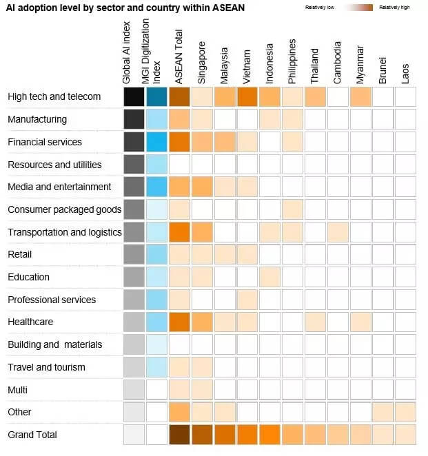 然而,人工智能的采用并没有实现其最大价值。前期实验和随后的实施需要公司对人工智能如何应用于其核心业务进行前瞻性和广泛的观察,而对于传统的非科技行业的公司来说,后期的实施可能会让人望而却步。到目前为止,高科技、电信和金融服务公司在东盟国家占据优势地位。我们也看到了交通和医疗等公共服务活动的激增,这是由多家政府机构和该地区的“智能城市”计划所推动的。