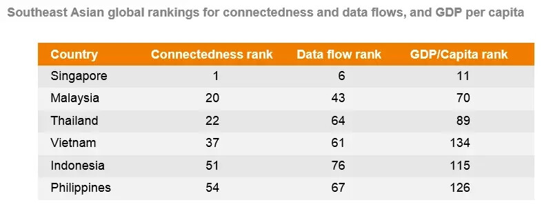 在东南亚国家之间,基于贸易和资金流的传统领域高度互联,但相关之间的数据流联系却不那么紧密。