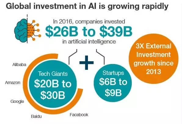 我们估计的数据显示,2016年全球范围内的企业在人工智能领域的投资在200亿美元到300亿美元之间。这既包括内部研发投入,也包括稳定的收购流量。到目前为止,阿里巴巴、亚马逊、百度、Facebook和谷歌等科技巨头在人工智能领域的投资总额已经超过了该领域总投资的四分之三。从2011年到2017年2月,这些公司在美国完成了55宗大型并购交易中的29宗,在中国的10宗重大交易中的9宗。