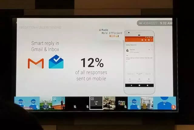 Google将机器学习用于邮件回复中,推出智能回复的功能,当用户要回复邮件的时候,智能回复可以自动给一些建议的回复内容,可以加速我们的办公效率,尤其是在使用手机回复邮件的时候。Jeff Dean称,目前有12%的邮件回复是在手机上进行的。