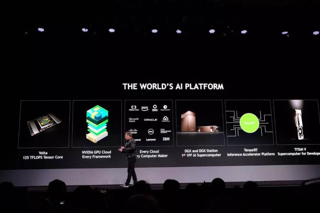 黄仁勋表示英伟达已经构建了一套「世界级」的 AI 平台,包括 Volta 架构的 GPU、云端 GPU 处理能力、DGX 超级电脑和 TITAN V 显卡等。