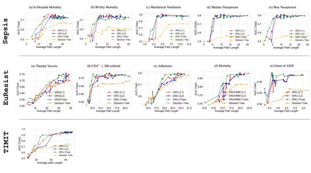 图 9:正则化模型在 Sepsis(5/5 输出维度)、EuResist (5/15 输出维度)和 TIMIT 的 APL 上的性能对比。可以看到在 APL 较小时,性能与图 8 类似,树正则化达到更高的性能。更多详细结果和讨论见论文 https://arxiv.org/pdf/1711.06178.pdf。