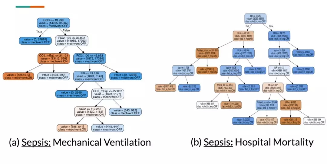下图展示了针对 Sepsis 中 2 个输出维度的模仿性决策树。由于我们不是医生,因此我们请一位败血症治疗专家检查这些树。