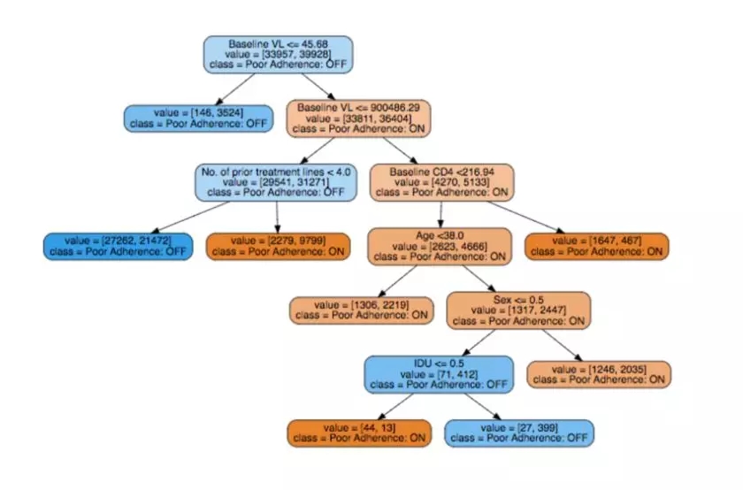 为了把事情做到底,我们可以看看一个尝试解释病人不能服从 HIV 药物处方(EuResist)的原因的决策树。我们再次咨询了临床医生,他确认出,基础病毒量(baseline viral load)和事先治疗线(prior treatment line)是决策树中的重要属性,是有用的决策变量。多项研究(Langford, Ananworanich, and Cooper 2007, Socas et. al. 2011)表明高基线的病毒量会导致更快的病情恶化,因此需要多种药物鸡尾酒疗法,太多的处方使得病人更难遵从医嘱。