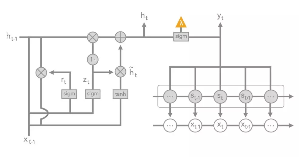 图 13:GRU-HMM 图解。x_t 表征时间步 t 上的输入数据。s_t 表征时间步 t 的潜在状态;r_t,h_t,h_t tilde,z_t 表征 GRU 的变量。最后的 sigmoid(紧挨着橘色三角形)投射在 HMM 状态和 GRU 潜在状态的总和之上。橘色三角形表示用于树正则化的替代训练的输出。