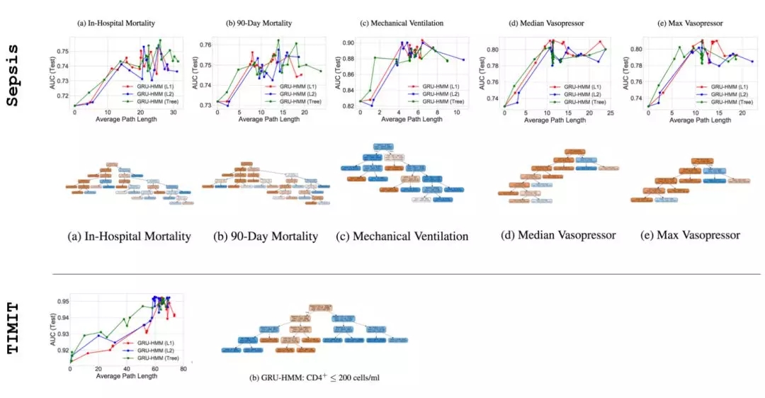 图 10:构建决策树以仿真已训练的树正则化 DNN(包含 Sepsis 的 5 个维度中的两个)。从视觉上,我们可以确认这些树的 APL 值较小,并且是可模仿的。