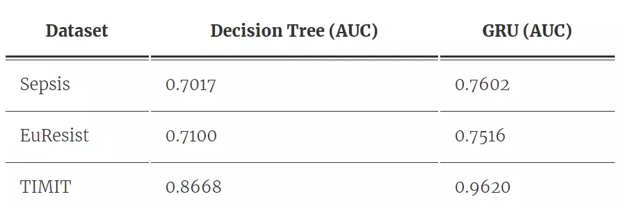 表 1:决策树和 RNN 在不同数据集上的性能。我们注意到 RNN 的预测能力比决策树优秀许多。