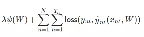 其中ψ为正则化器(即 L1 或 L2 正则化)、λ 为正则化系数或强度、W 为一组 RNN 的权重矩阵、y_nt 为单个时间步上的标注真值、y_nt hat 为单个时间步上的预测值。此外,损失函数一般可以选为交叉熵损失函数。