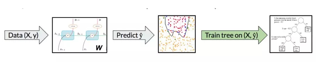 如果我们可以使用决策树代替 DNN,那么已经完成了。但是使用 DNN 尽管缺乏可解释性,但是它的能力远超过决策树。所以我们是否可以将决策树和 DNN 结合起来,构架具备模仿性的强大模型?