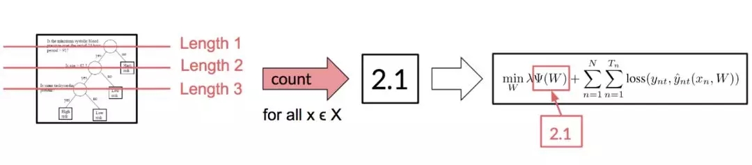 图 5:给定一棵决策树与数据集,我们能计算平均路径长度以作为模拟、解释平均样本的成本。通过把这一项加入到目标函数,我们就能鼓励 DNN 生成简单的 DT 树并惩罚复杂而巨大的决策树。