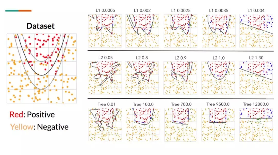 图 7:虚构的抛物线数据集。我们训练了一个深度 MLP,结合不同级别的 L1、L2 正则化和树正则化以测试最终决策边界之间的视觉差异。这里的关键之处在于,树正则化生成了坐标对齐的边界。然后我们用改变的正则化(L1、L2、树)和改变的强度λ训练了一系列的 MLP。我们可以通过描述单位正方形内所有点的行为并画出等高线以评估模型,从而逼近已学习的决策函数。图 7 展示了在不同参数设置下的已学习决策函数的并行对比。