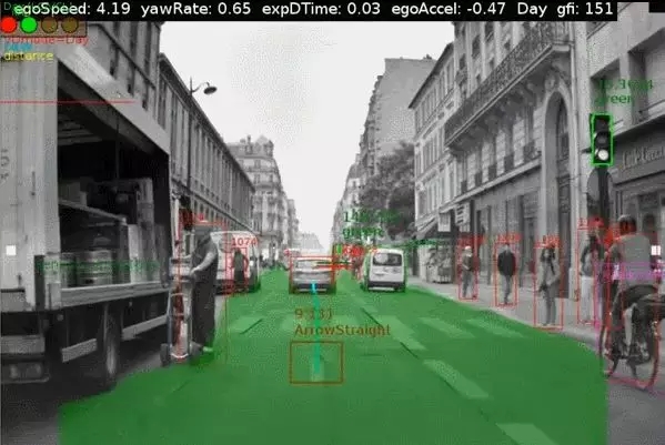 图中使用矩形框框中的物体。图中仅有汽车、行人和自行车等物体。其实障碍物的种类可以更丰富,比如摩托车、卡车,甚至动物都是可以检测到的。有了障碍物信息,无人车即可完成车道内的跟车行驶。