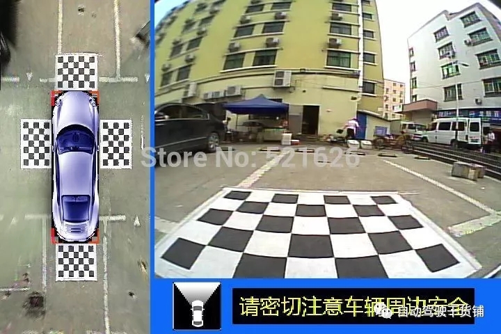 通过标定值,进行图像的投影变换,可将图像还原成俯视图的样子。之后对四个方向的图像进行拼接,再在四幅图像的中间放上一张车的俯视图,即可实现从车顶往下看的效果。如下图。