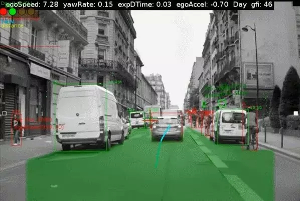 图中使用绿框框出来的物体。交通信号灯状态的感知能力对于城区行驶的无人驾驶汽车十分重要,这也是为什么百度Apollo 2.0实现“简单路况自动驾驶”所必须开放的功能。