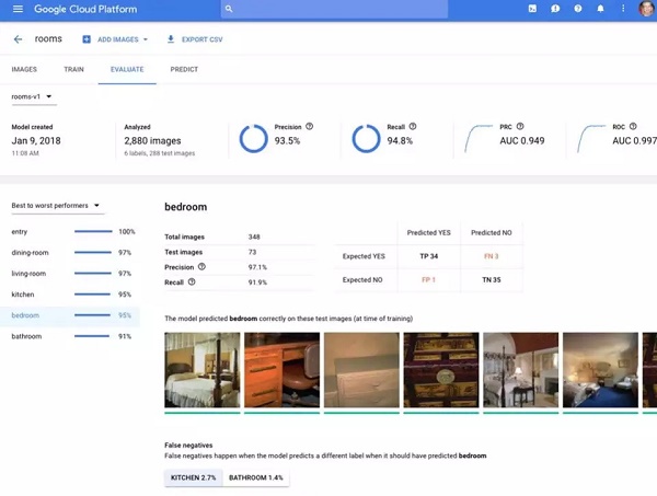 图:谷歌的Cloud AutoML提供了一个控制板,使开发人员能够轻松评测AI模型的精确度。