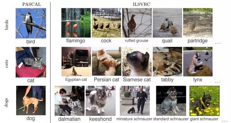 在下图中,左边是另一个图像分类挑战赛 PASCAL 中的样例图像。在 PASCAL 竞赛中,有近 20000 张训练图像和 20 个物体种类。这项竞赛中有很常见的类,比如像下图中的“鸟”,”狗“和”猫“。再看 ImageNet 挑战赛,跟前面的竞赛完全不同。ImageNet 并没有一个叫做”狗“的普通类,ImageNet 对每个品种的狗都有一个对应的类。不同于 PASCAL 只有”狗“这一种类,对于不同品种的狗,ImageNet 共有 120 个类。因此任何能够用于这个任务的算法或模型都必须能够处理这些非常细粒度的、详细的类,即使它们看起来非常相似并难以区分。