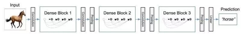 在文章《Densely Connnected Convolutional Networks》中提出的 DenseNet 将快捷连接发展到了极致。DenseNet 扩展了 ResNet 中快捷连接的想法,但比其具有更稠密的连接: