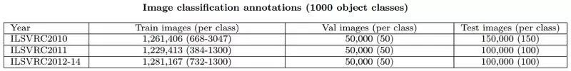 那么 ImageNet 挑战赛的难点在哪里呢?让我们先从它的数据开始说起。ImageNet 分类任务的数据是经过手工标注的 1000 类图片,这些图片来自于 Flickr 和其他搜索引擎。数据的分布情况如表格所示: