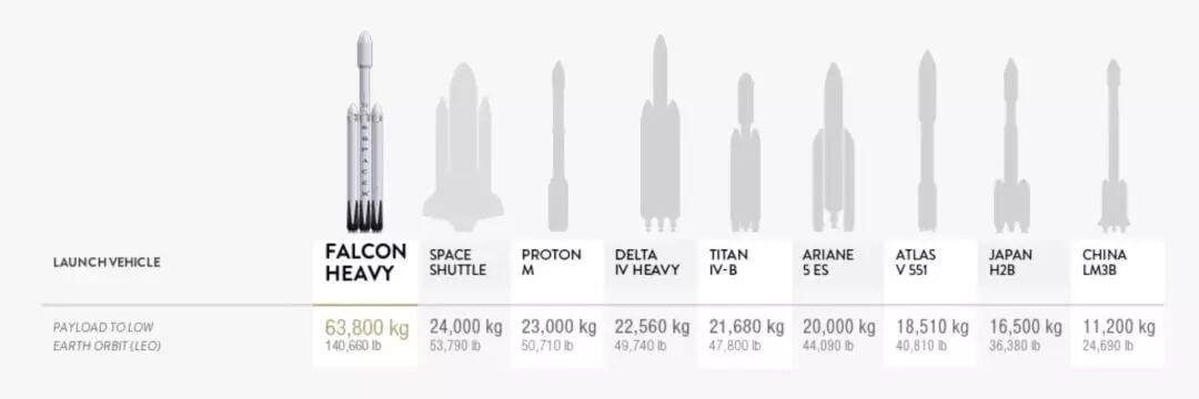 Space X官网显示,重型猎鹰最多可将63.8吨的负载送上近地轨道,为目前全球现役的航天器之最。仅有当年为登月提供推力支持的土星五号(Saturn V)可以与之媲美。