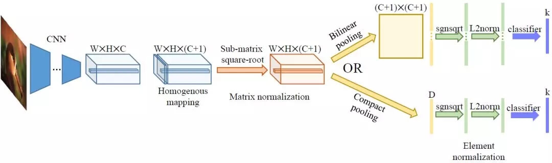 上述特征编码的一个重要缺陷是编码后特征的维度极高。由于张量相乘,最后的特征维度是,其中 C 是最后一个卷积层的特征通道数。即使在 C 相对较低的情况下,如 VGG16 中,C = 512,最后特征的维度也超过 260K。该问题可通过随机投影(random projection)、张量速写(tensor sketching)和低秩属性来缓解。但是,由于矩阵方幂归一化层应用在池化矩阵 M 上,因此很难结合矩阵归一化和紧凑池化来同时达到更好的性能和更低的最后特征维度。