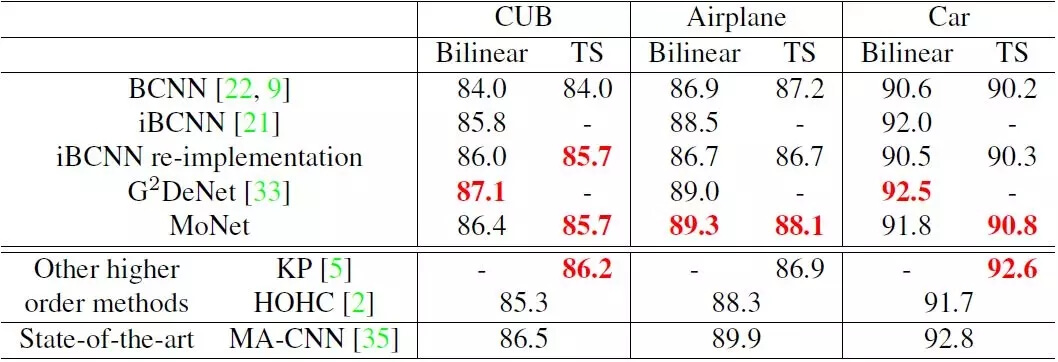 表 4:细粒度分类上的实验结果。双线性和 TS 分别表征全双线性池化和 Tensor Sketch 紧密池化。每栏中的最佳表现标为红色。