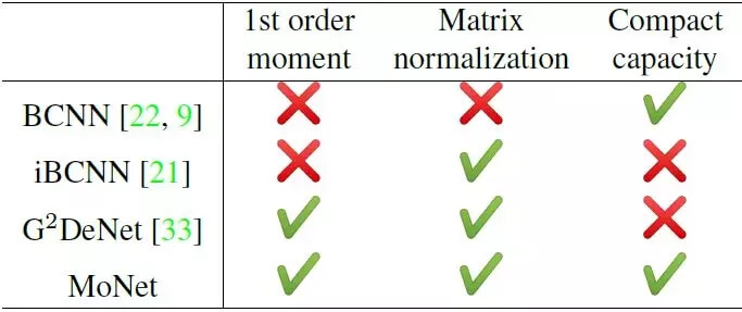 表 1. 不同神经网络的二阶统计信息对比。双线性 CNN(BCNN)仅具备二阶信息,没有使用矩阵归一化。改进后的 BCNN(iBCNN)和 G^2DeNet 都利用了矩阵归一化,但是都受制于高维度,因为它们需要计算一个很大的池化矩阵的平方根。本论文提出的 MoNet,在新型子矩阵平方根层(sub-matrix square-root layer)的帮助下,可以直接归一化局部特征,同时,通过使用紧凑池化(compact pooling)替代全双线性池化,可以大幅降低最后的表示维度。