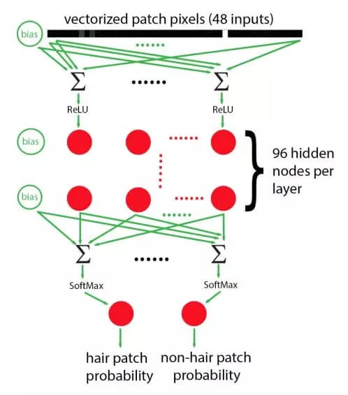 神经网络架构如下图所示,基本上是一个二分类模型,输入是4*4(4*4*3=48)的图像片,中间每一层包含96个隐含单元,最后分类出输入片层头发和非头发的概率。