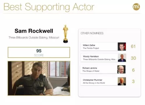 最佳男配角的竞争更激烈,不过,山姆 · 洛克威尔(Sam Rockwell)在《三块广告牌》上的角色显然更受欢迎,得到95分。威廉·达福(Willem Dafoe)凭借《弗罗里达项目》(The Florida Project )得到61分。