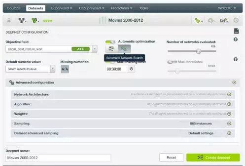 像去年一样,我们为每个奖项类别训练一个单独的模型。不同的一点是,今年我们使用Deepnet,这是一个深度神经网络,而不是去年使用的集成模型(ensembles)。使用BigML deepnet及其独特的强大自动优化选项(“自动网络搜索”)是确保构建性能最佳的分类器的最简单、最安全的方式。因为几十个不同的网络同时在后台训练,每个模型只需要大约30分钟的训练时间,但是因为最终的模型需要通过试错来优化,仍然需要大量时间。