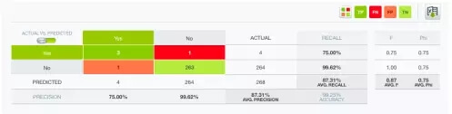 我们使用2000年到2012年间的电影来训练模型,然后使用2013年至2016年间的电影数据评估模型。在所有奖项类别中,我们得到超过0.98的ROC AUC,这意味着模型能够连续四年(2013年至2016年)预测获奖者,很少有错误。例如下方预测最佳女主角的混乱矩阵,它能准确预测出4个测试年份中的3个。