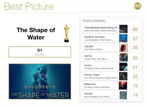 《水形物语》以91分被预测为最佳影片。不过模型也给其他提名影片不错的分数,《三块广告牌》得到68分。