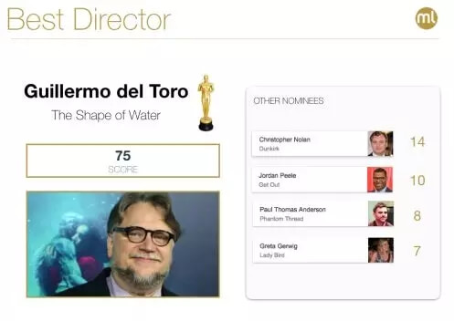 对于最佳导演奖,模型没有任何犹豫。 吉列尔莫·德尔·托罗( Guillermo del Toro )得到最接近获奖的75分,其他提名人的分数没有接近他的。