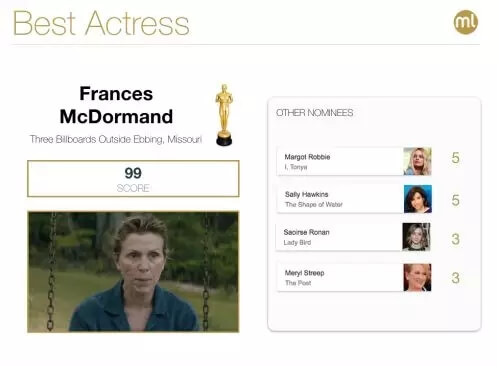 同样,对于最佳女主角奖项,似乎也不存在竞争。 Frances McDormand得到99分,毫无疑问是最受欢迎的。其他候选人的分数远远落后,Margot Robbie只得到5分。