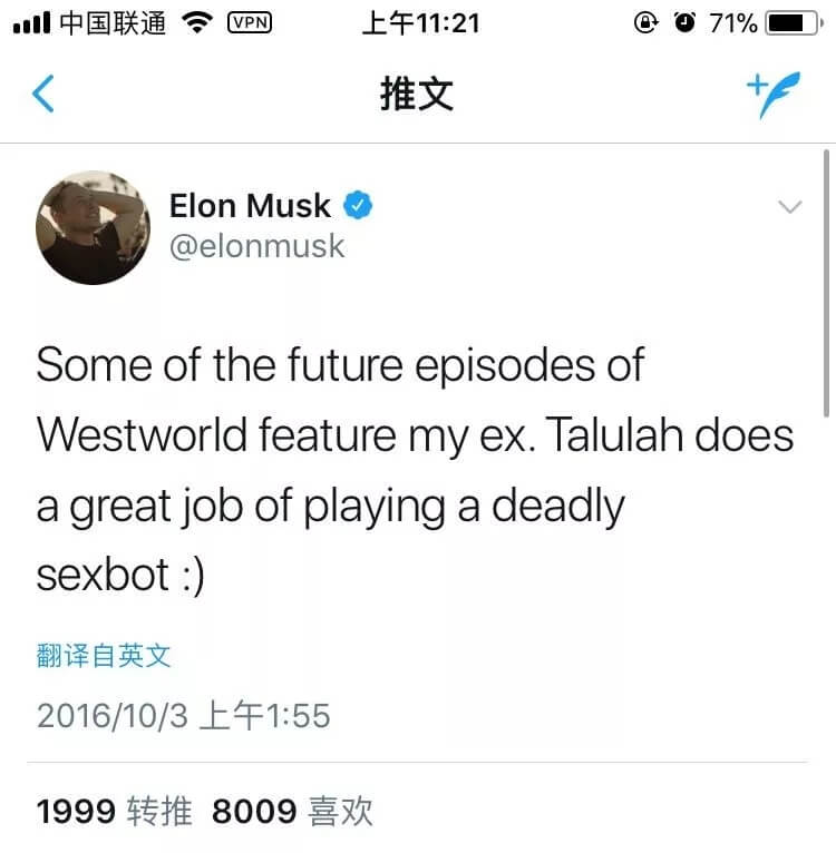 有趣的是,马斯克的第二任妻子Talulah Riley也在《西部世界》中扮演一个“性感机器人”的角色,马斯克还曾经发推特提到过此事。