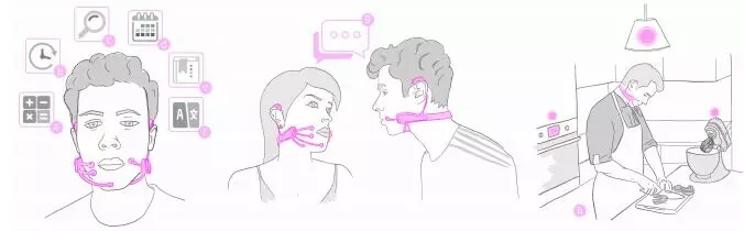 同时它还配备了骨传导耳机与用户进行交互,不会打扰到正常的沟通和听觉体验。这种新型设备属于IA(intelligence-augmentation智能增强)设备的一种,可以极大地延伸人类的认知能力。研究人员发明的初衷在于平日手机或移动设备使用的不便。我们的生活已经离不开移动设备了,但与设备的交互方式却依旧显得那么突兀。