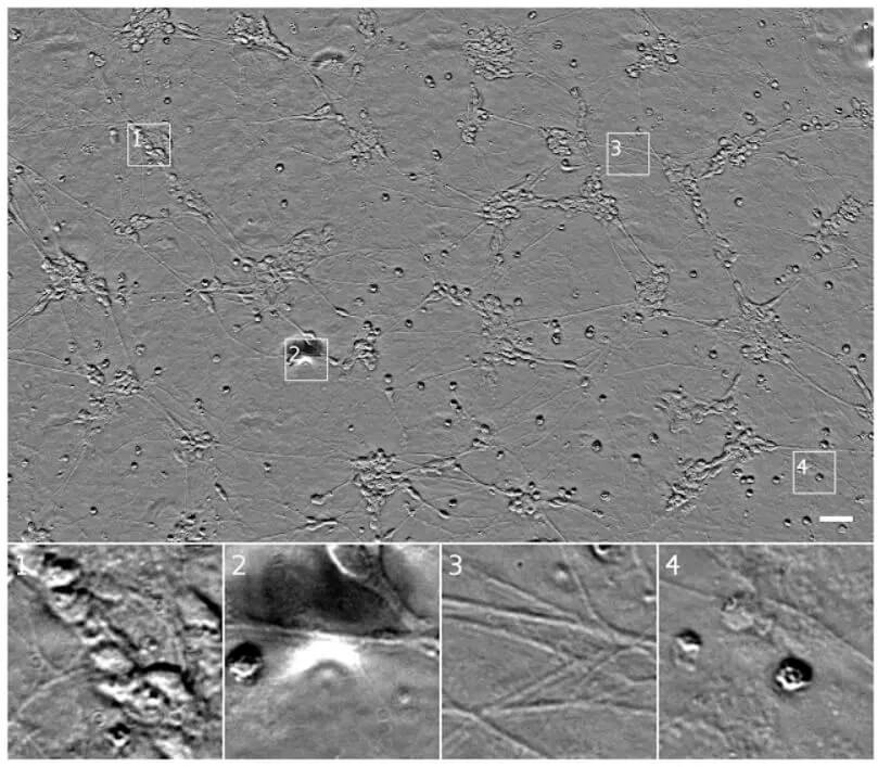 来自诱导性多能干细胞的人类运动神经元培养物的透射光(相差显微)图像。Outset 1 展示了一群细胞,可能是神经元。Outset 2 展示了图像中的一个裂痕,它遮挡了底层的细胞。Outset 3 展示了神经轴突。Outset 4 展示了细胞死亡。上图比例尺为 40 μm。本文图源:格莱斯顿研究所(Gladstone Institutes)史蒂夫·芬克拜纳实验室(Finkbeiner lab)。