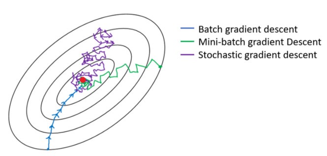 下图显示了梯度下降的变种方法以及它们朝向最小值的方向走势,如图所示,与小批量版本相比,SGD的方向噪声很大: