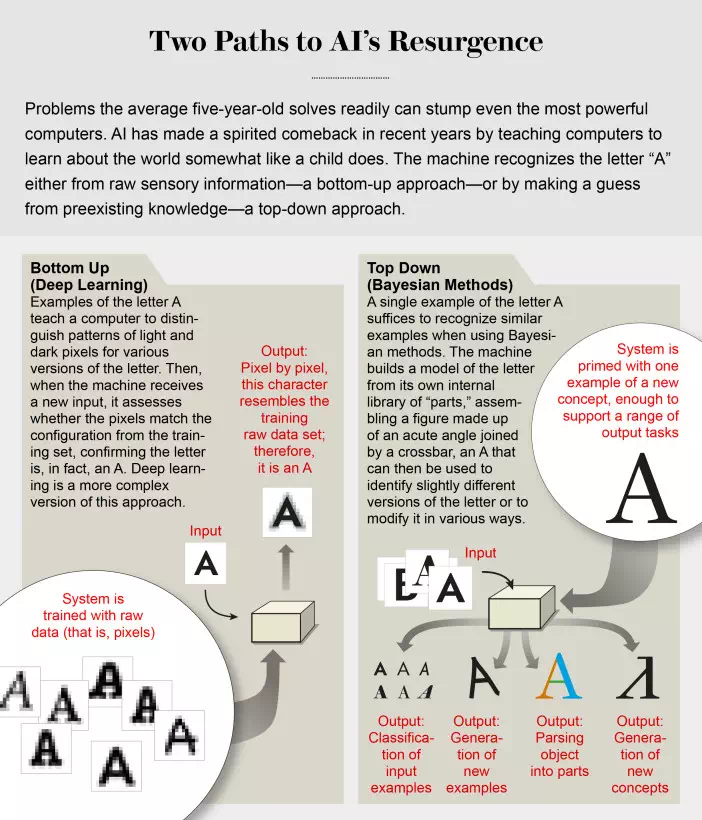近些年来,人工智能领域在使用“由底向上”或是“由顶向下”两种架构而实现机器学习的矛盾中螺旋前进。“由顶向下”的方法利用系统已知的只是来推论新的知识。柏拉图,或者诸如René Descartes这样理性学派的哲学家们相信,而“由顶向下”的学习方法更加高效适用。在2000年左右,人工智能行业的概率论:贝叶斯模型也经历了重生。“由顶向下”的算法如同科学家们的思考方式一样:基于对客观世界的抽象和假设,来预测数据的正确性。并且根据返回的结论来修正假设的正确性。