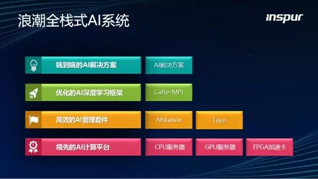 面对AI的浪潮,浪潮的“弄潮动作”分为四种,分别是计算平台的产品创新、AI管理系统、框架优化和端到端全方位解决方案。