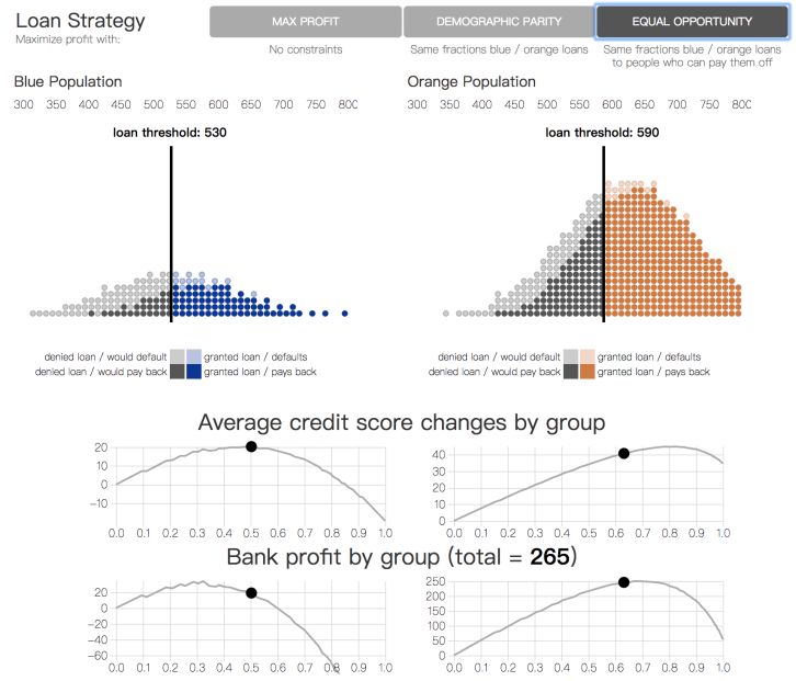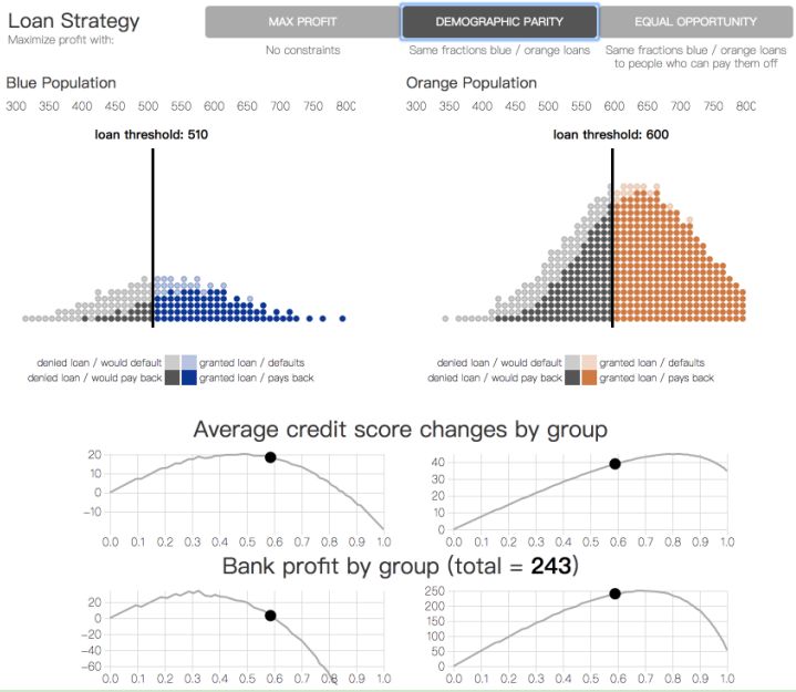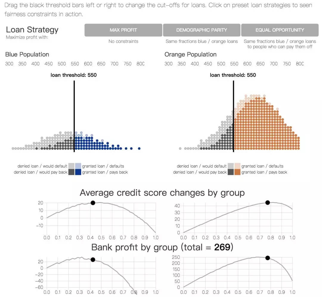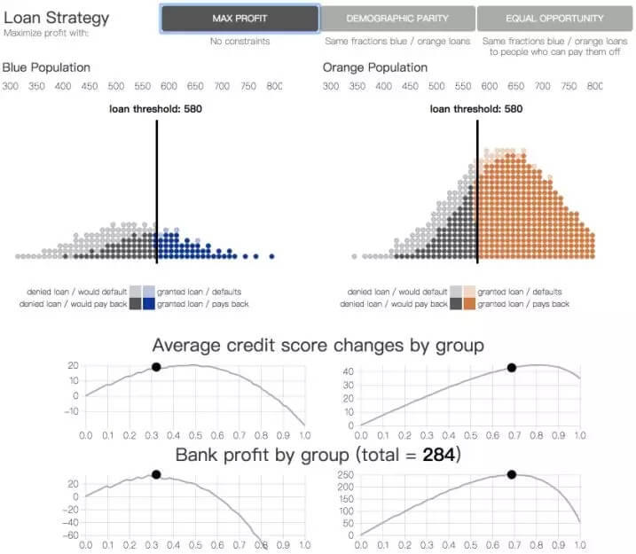 有一个较为常见的公平性准则,人口统计平等(demographic parity),要求银行在两个群体中借出相同比例的贷款。在此前提下,银行继续尽可能最大化收益。另一个准则,机会平等(equality of opportunity),强调两个群体中的真正率(true positive rate)要相等,这要求银行对两个群体中会偿还贷款的个体给出相同的贷款比例。
