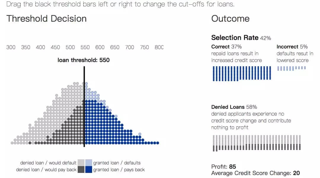而这篇论文主要讨论了在调整以长期社会福利(long term social welfare goals)为目的的机器学习决策方面的近期相关工作。通常来说,机器学习模型会为每个个体产生一个得分(score)来描述关于这个个体的信息。比如,信用得分描述了某个个体的信用历史和财务行为,它可以被银行用来评定这个个体的信用等级。本文中仅以贷款场景为例,详细介绍这一问题。