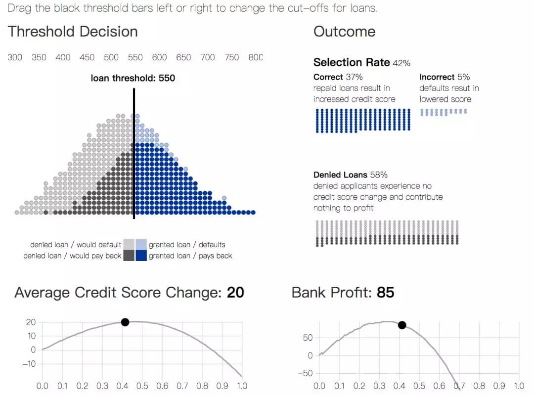如果采用公平性准则的目的是提升或公平化所有群体的长期幸福感,那这个展示的结果表明,在某些场景下,公平性准则实际上违背了这一初衷。换句话说,公平性约束会进一步减少弱势群体中的福利。建立更加准确模型,以预测每种策略对各类群体可能产生的影响,也许在将来可以缓解由于引入公平性约束可能产生的意料以外的伤害。