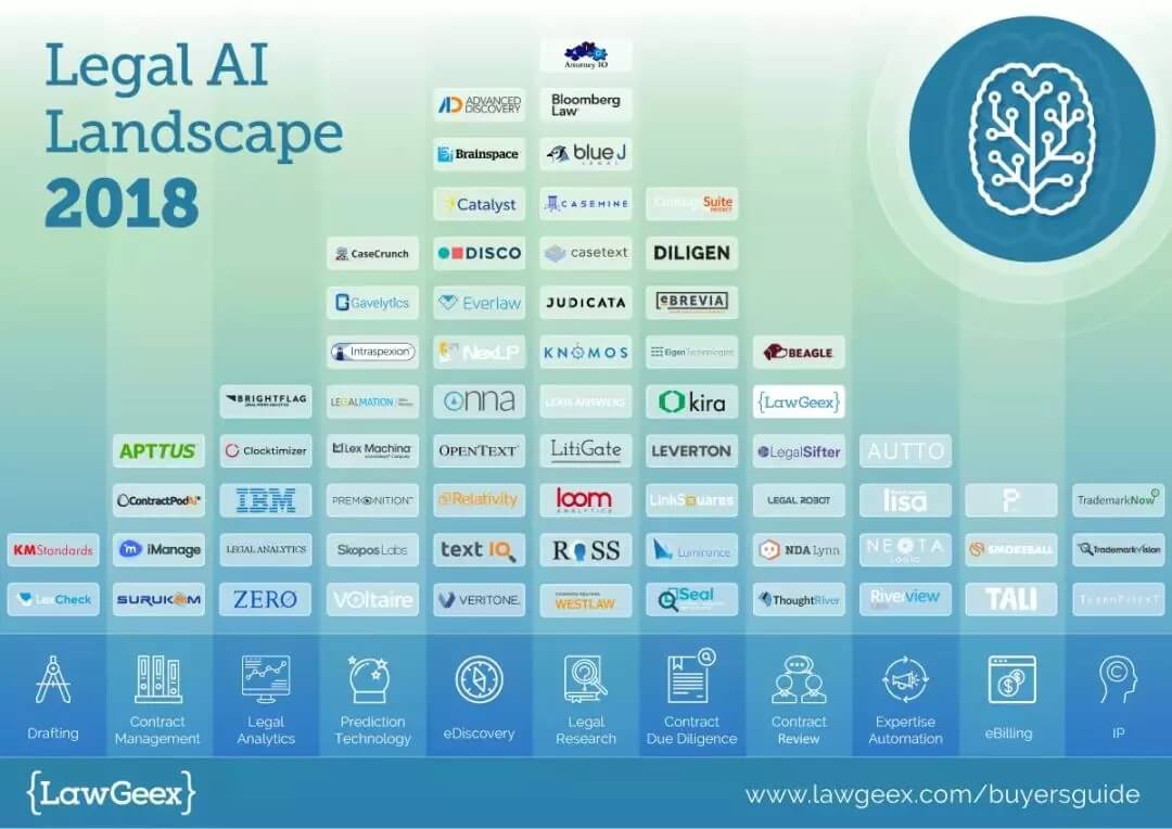 在 The In-House Counsel’sLegalTech Buyer’s Guide 2018 这份报告中,LawGeex 发现与去年相比,采用了人工智能的法律技术公司增长了 65% (下图显示,现在已有 67 个法律人工智能公司。)