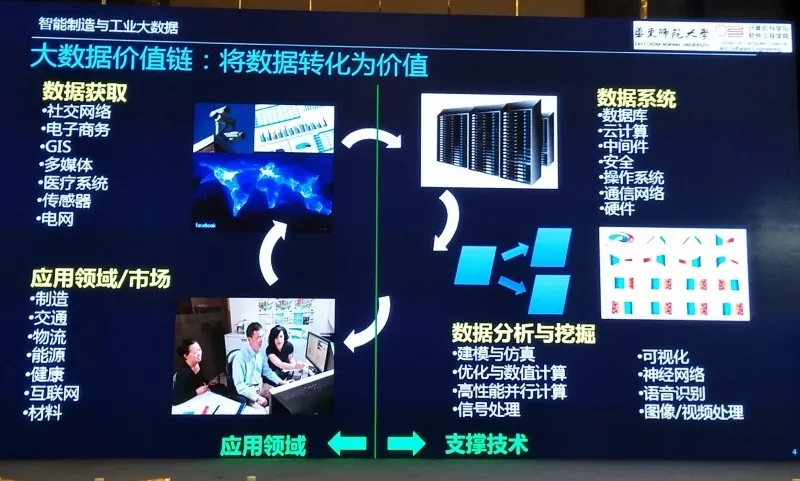 这张图有关大数据价值链,分成两大部分:第一个是相关支撑技术,第二个是应用领域。从支撑技术方面,我们有数据获取、数据的分析和处理系统、做数据的分析与挖掘。从应用领域来说,行业市场很大,有制造业、智能交通、智能物流、能源、健康、互联网、材料。