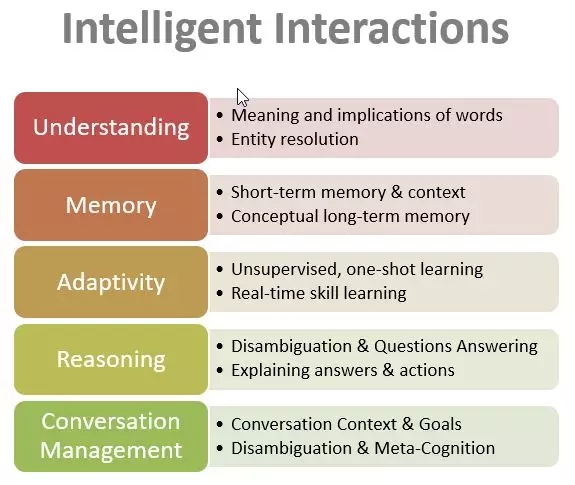 基于通用人工智能的设计将根据定义和设计来涵盖这些高级要求。他们将有更深刻的理解能力,拥有短期和长期记忆,推理能力和大量的常识,从而达到能够处理复杂对话的能力。
