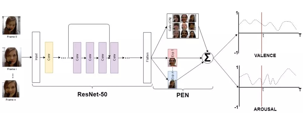 上图是研究中提出的模型架构,其中研究人员首先利用Faster R-CNN从视频帧中提取出面部区域,随后利用ResNet-50学习出面部的深度特征,并将这些特征馈入个性化专家网络(personalized expert network PEN)中,用于自动估计主体的预约和兴奋程度。同时还包括了门网络(gating network CN),在推断新图像时为PEN中不同的专家分配权重。